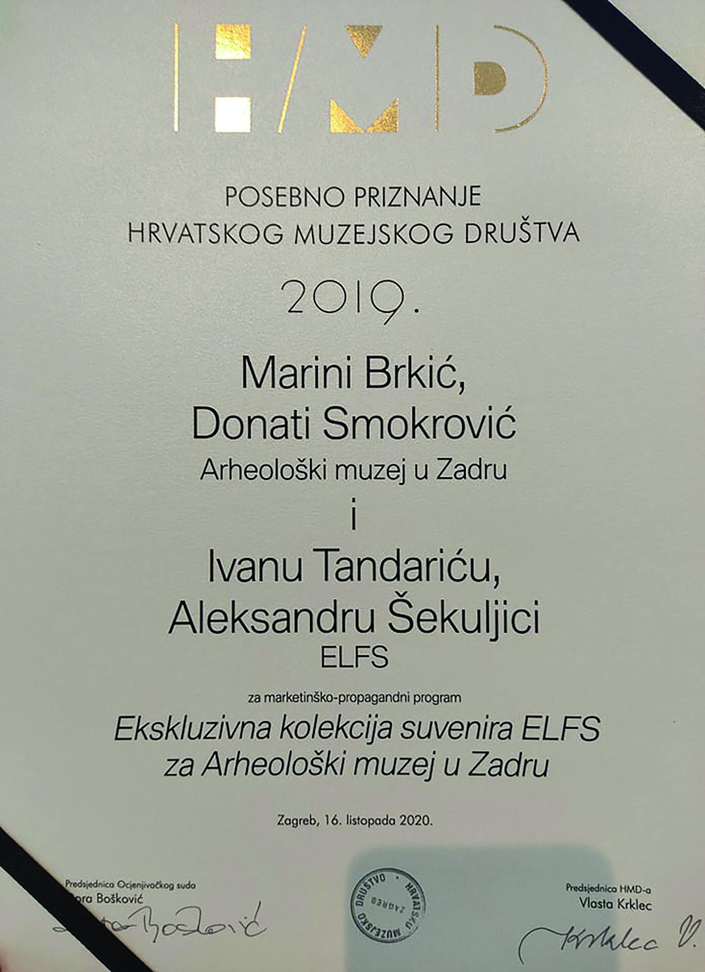 Posebno priznanje dodijeljeno je Marini Brkić i Donati Smokrović za program koji je realiziran u suradnji s hrvatskim modnim dvojcem ELFS, koji čine dizajneri Ivan Tandarić i Aleksandar Šekuljica. Svojim dizajnerskim idejama, kreativnošću i energijom osuvremenili su motive iz postava Arheološkoga muzeja Zadar. Dizajn je osmišljen za majice, tunike i torbe koje krase sljedeći motivi: stilizirani muški i ženski likovi iz željeznoga doba (6. st. pr. Kr.), keramički vrč u obliku ljudske glave iz 1. stoljeća i kip rimskoga cara Augusta, također iz 1. stoljeća.